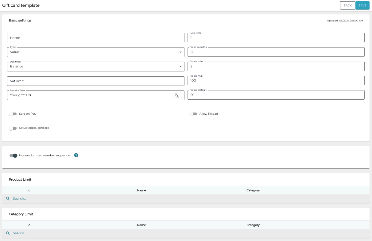The default validity period of the gift card must be defined here; the validity period can be modified when the actual gift card is created.