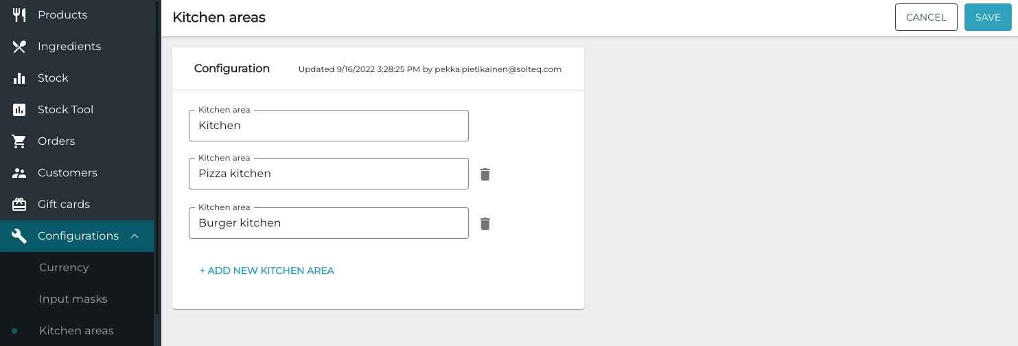 After saving, if at least one Store in your company has Kitchen areas enabled, a new Kitchen areas menu item is displayed under Configuration. Click the item to access the Kitchen areas view.