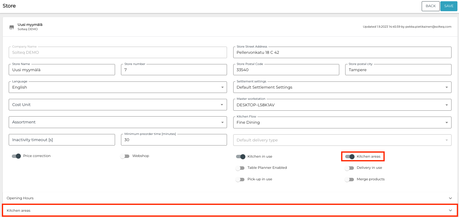 After enabling Kitchen areas, a new Kitchen areas section is displayed (under Opening Hours). When you click to extend the new section, a list of different Kitchen Areas is displayed: