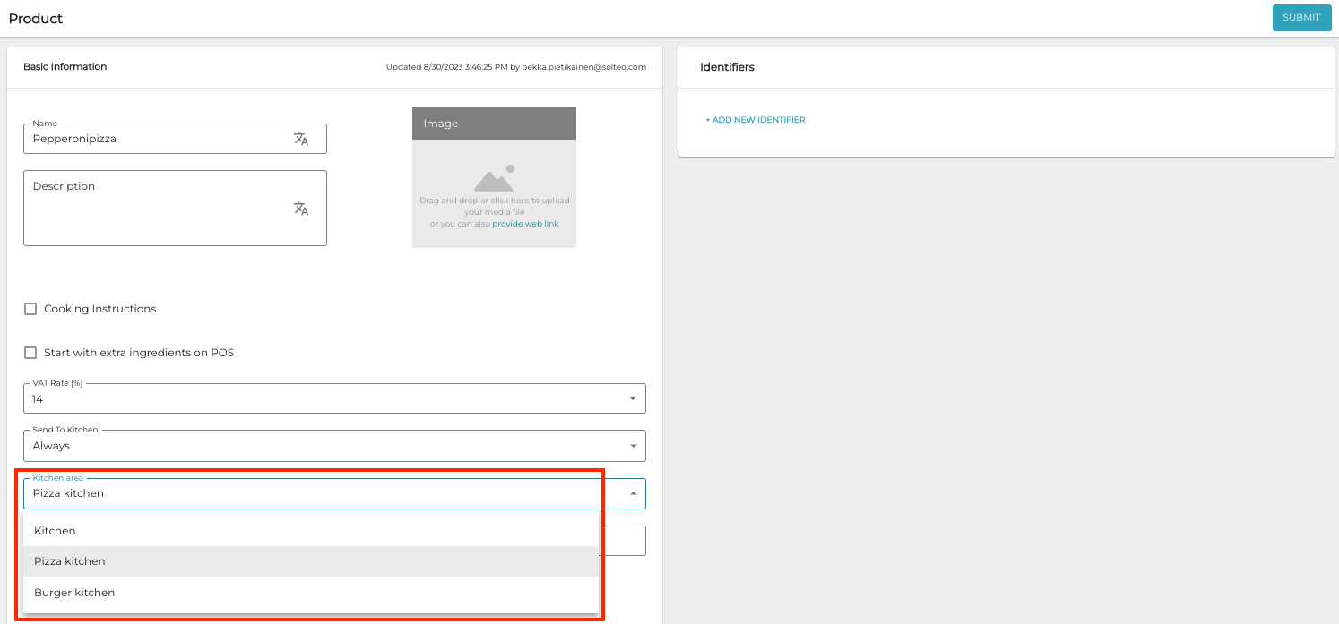 The Kitchen Area selected in the product details indicates to which Kitchen Area that product should be sent, if the Store has such Kitchen Area configured.