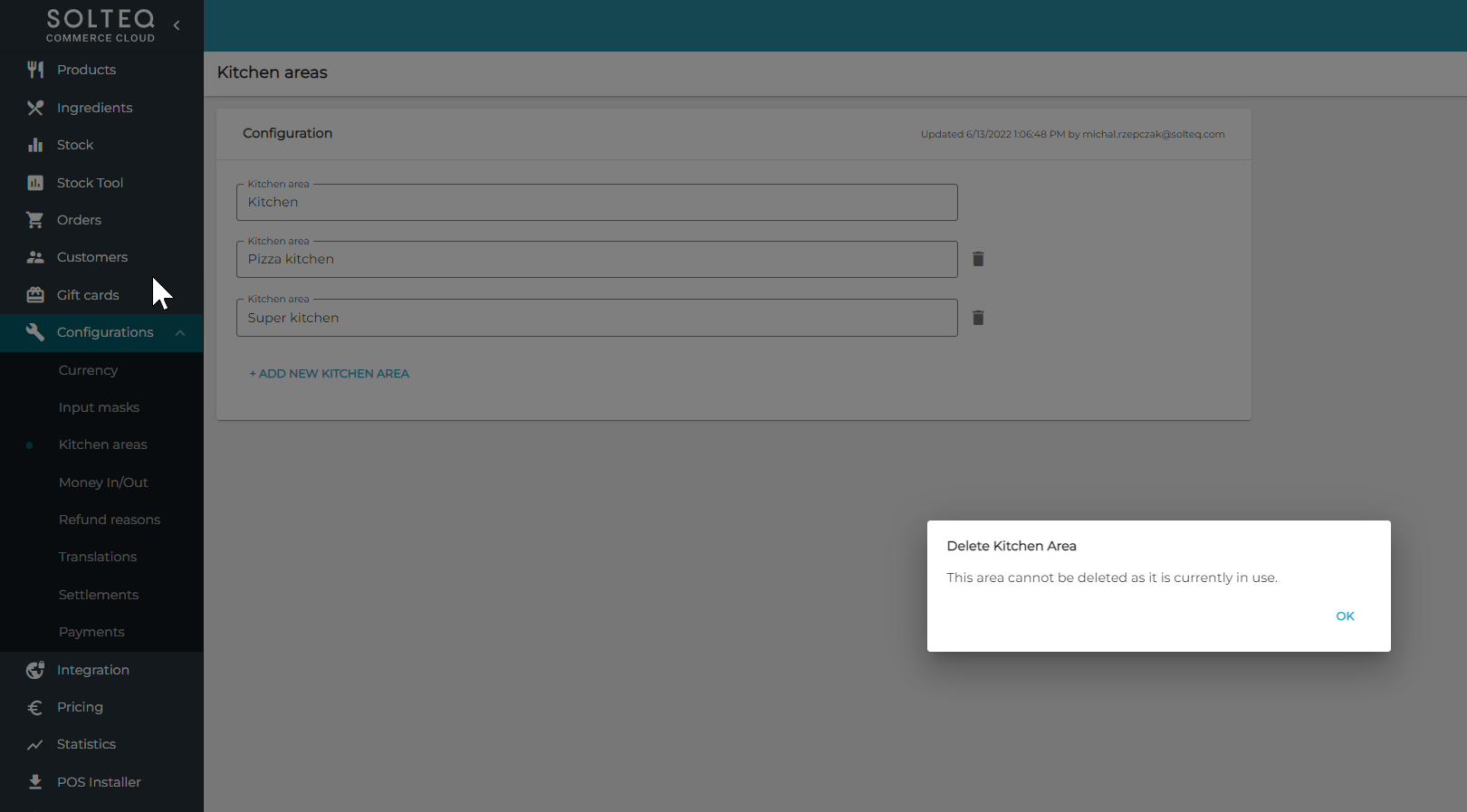 Kitchen Areas that are already assigned to a Store cannot be deleted. To delete such a Kitchen Area, remove it first from the Store configuration.