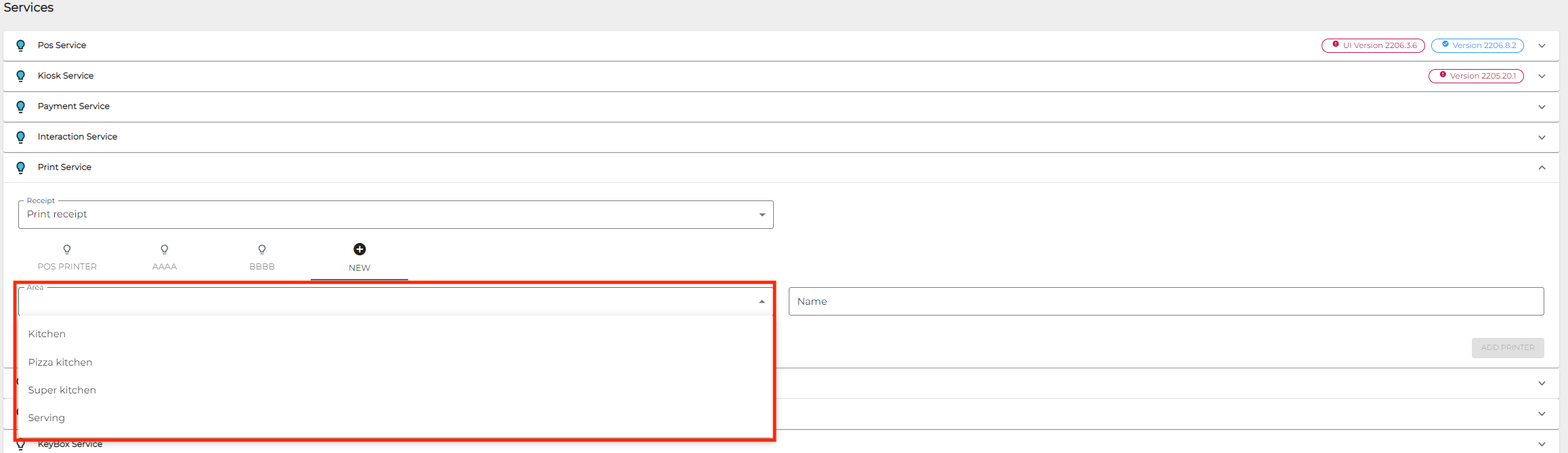 If the Store the workstation belongs to has Kitchen Areas enabled, there is a new Area option when adding printers in Print Service settings of the workstation. This setting allows you to configure different printers per Kitchen Area. If the Store does not have Kitchen Areas enabled, only the default Kitchen and serving options are displayed.
