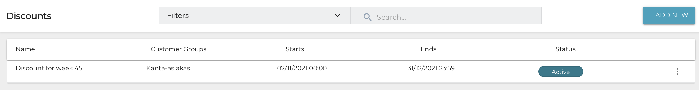 Click Save to create the new discount. The discount is now listed in the Discounts view.