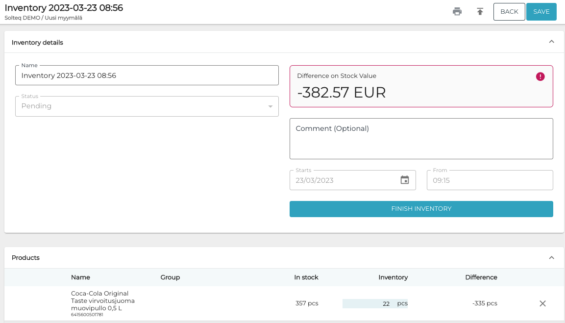 When the inventory is ready, click Finish Inventory and confirm this by clicking Finish. The stock balances of stock items are updated, and the inventory status is updated to Done.