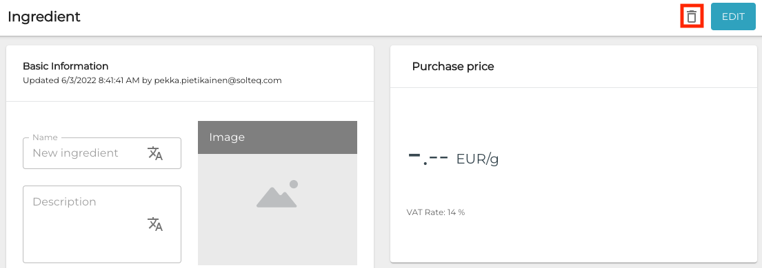 In the Ingredient Details view, click the Delete icon in the upper right-hand corner.