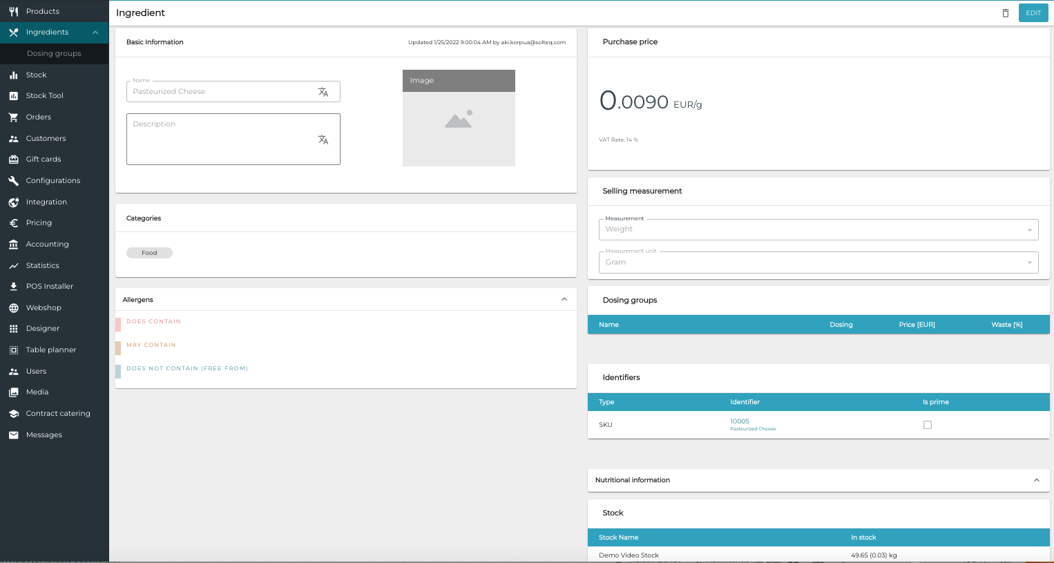 By clicking on an Ingredient you can view its details. Click Edit to modify the details, and Submit to save your changes.