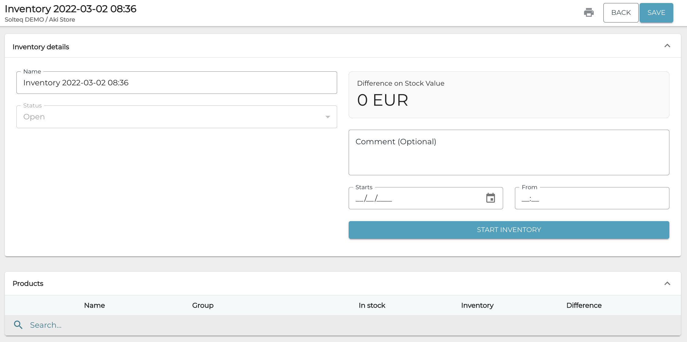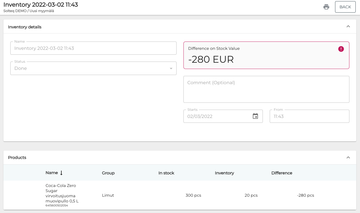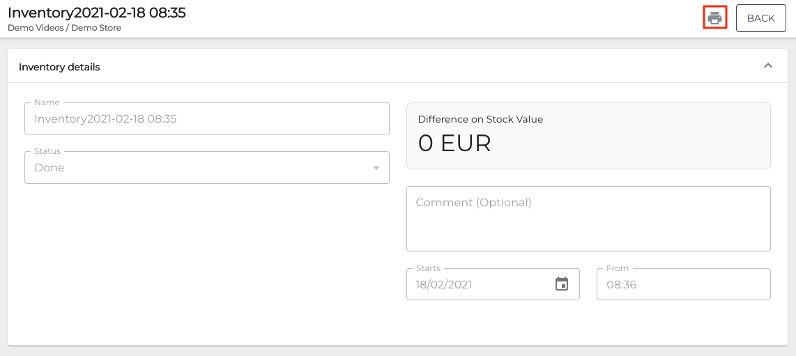 (Optional) If you selected certain products or categories for inventory in Step 3, you can print out a checklist of inventory items to facilitate the inventory. To do this, click the Print icon in the inventory’s details.