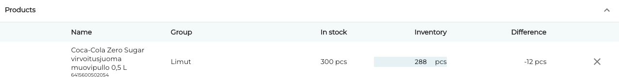 As an alternative for searching products manually, you may also use the global barcode scanner to read barcodes in this view. To do this, simply read a barcode with your physical scanner while this view is open. If the scanned product has already been added to the inventory, it is not re-added, but highlighted instead.