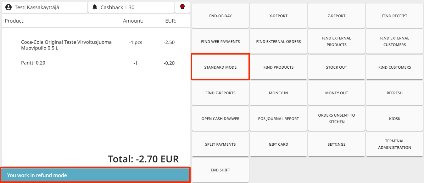 When in Refund Mode, the text You work in refund mode is displayed in the basket, and the Refund Mode tile is replaced by Standard Mode tile. Product prices are automatically negative in Refund Mode.