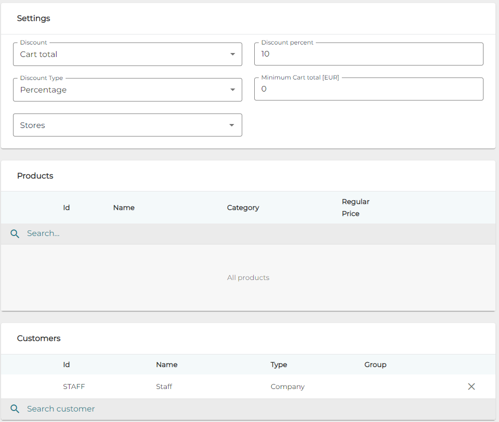 In the example below, a 10 % discount is applied to the total price when a member of the STAFF customer group is added to the Basket.