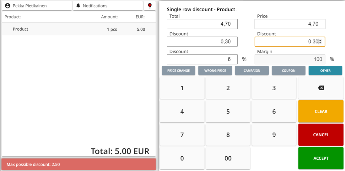 If any other reason code than Price Change is used, the maximum discount limit will be applied to the contents of the Basket. In the example below, giving more than €5 discount from the total price is not allowed.