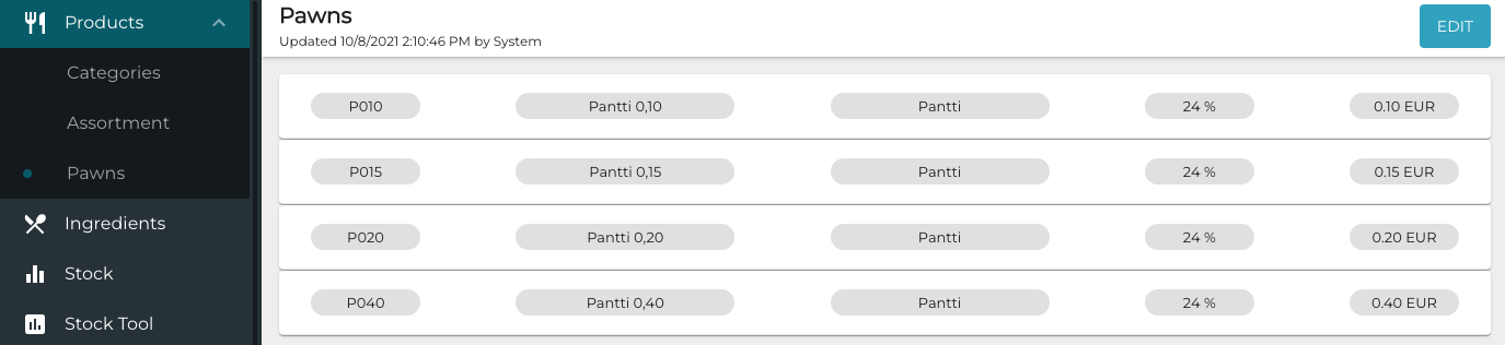 To access the view, click Products and select Pawns in the Back Office menu. Solteq provides a set of pre-made pawns, as seen in the image below.