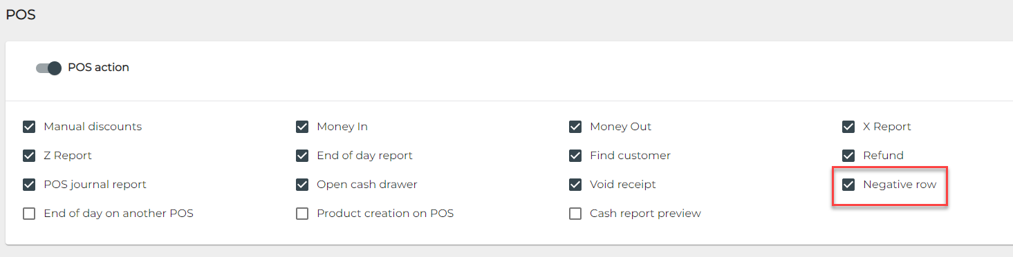 The user group for POS users who need to use this feature must have permission to use Negative row POS action; give the user group the permission.