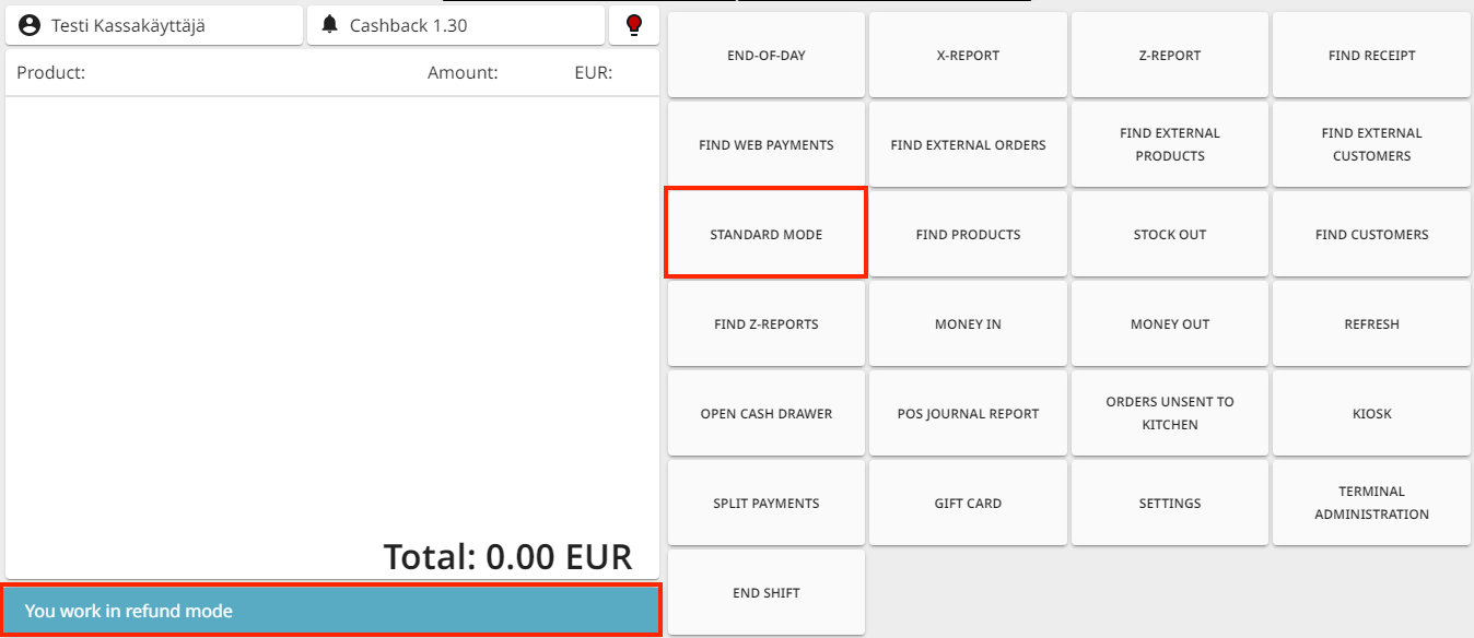 Press Refund Mode. When in Refund Mode, the text You work in refund mode is displayed in the basket, and the Refund Mode tile is replaced by Standard Mode tile.