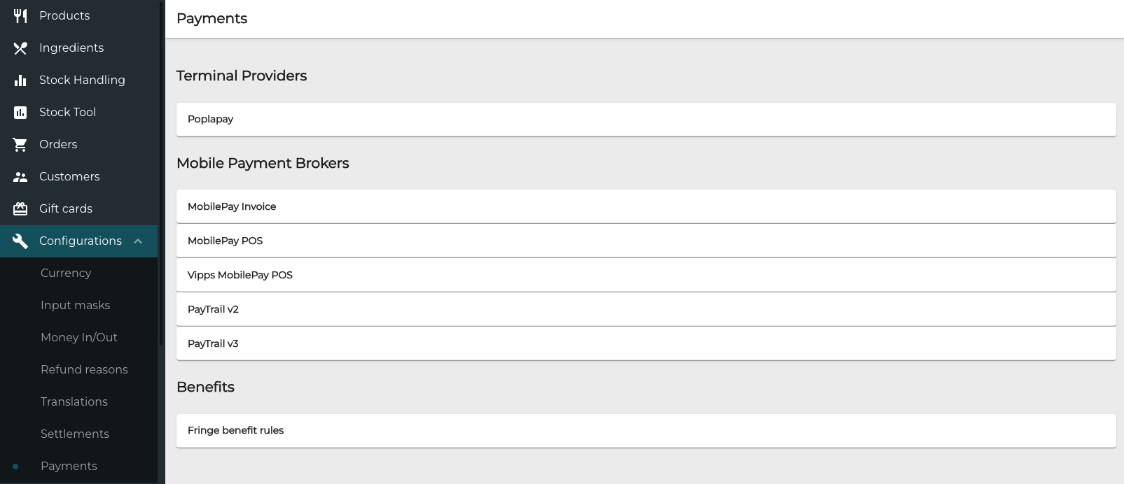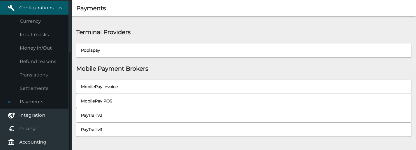 In the Payments view of the Back Office you can define Terminal Providers and Mobile Payment Brokers used with Solteq Commerce Cloud. To access the view, click Configurations and select Payments in the Back Office menu.