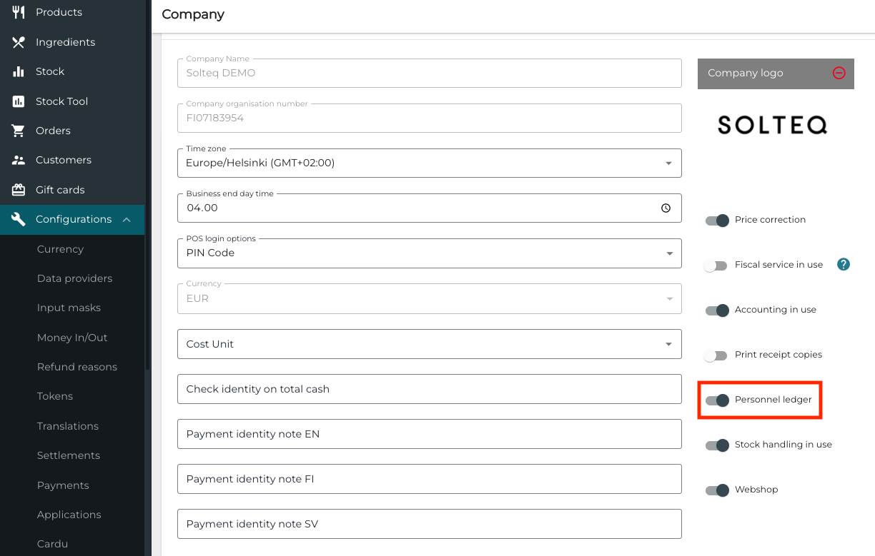 In the Back Office Company Configurations, switch the the Personnel Ledger switch to ON position.
