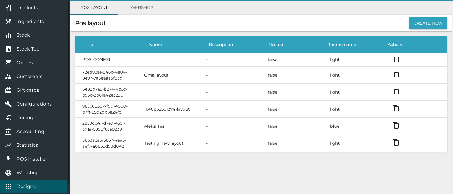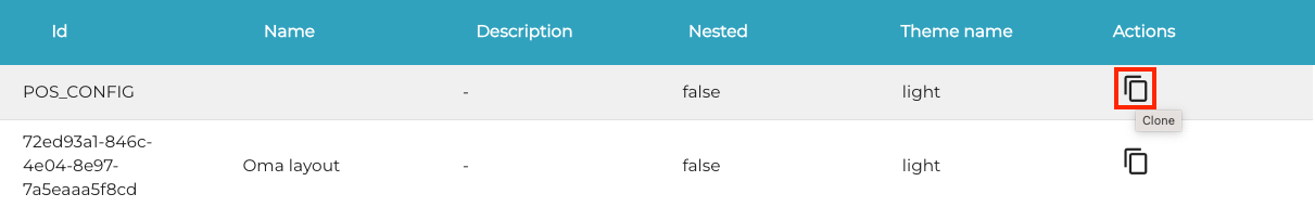 You can clone a layout by clicking on the Clone icon on the row of a POS layout.