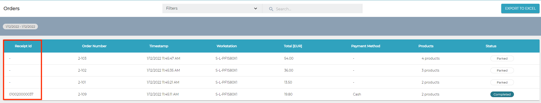 In the Back Office, orders without Receipt Id are displayed with a - (dash) in the Receipt Id column.