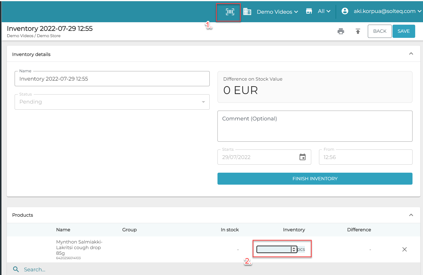 We have added support on inventory and purchase order for global barcode (see 1. in the figure below) function to enter a product’s SKU directly, or use the scanned barcode.