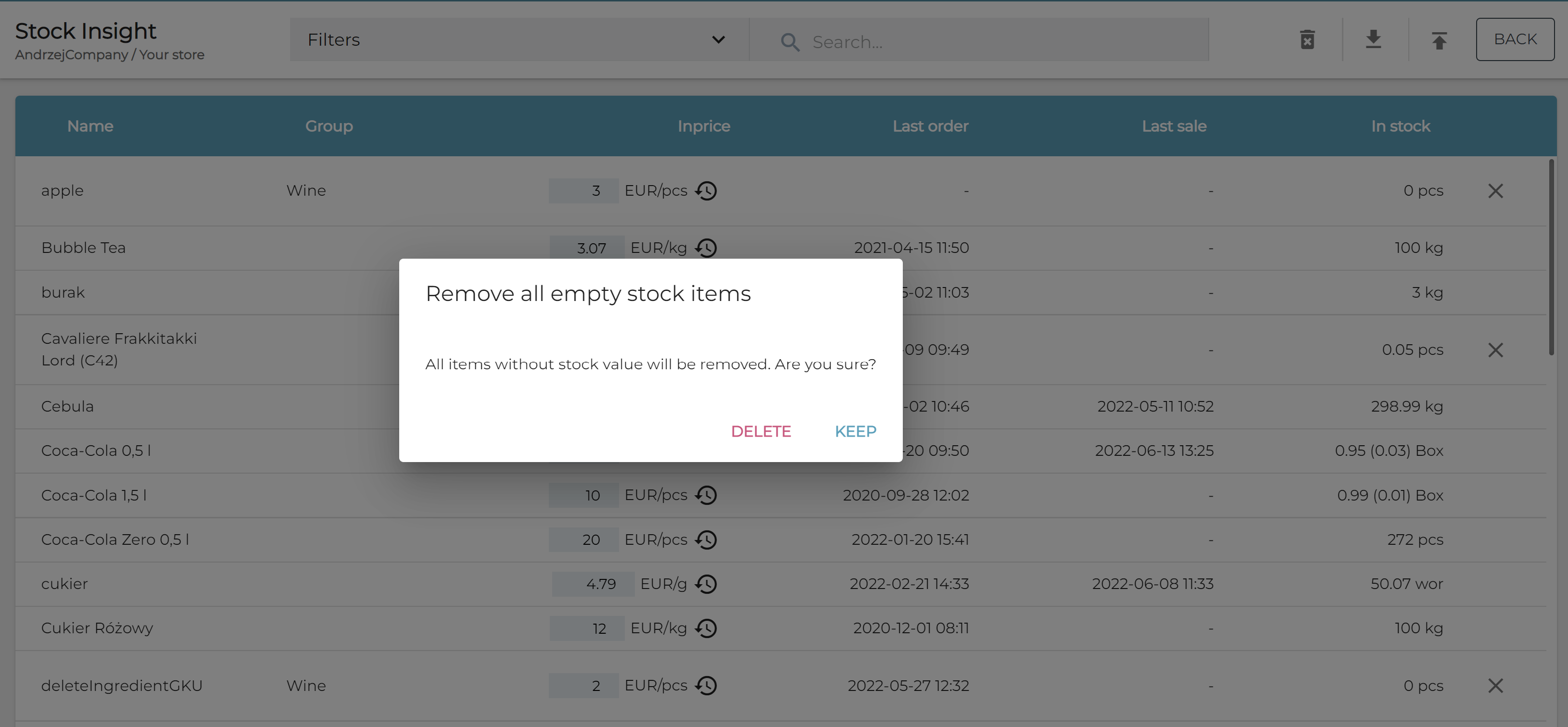Remove all empty stock items confirmation