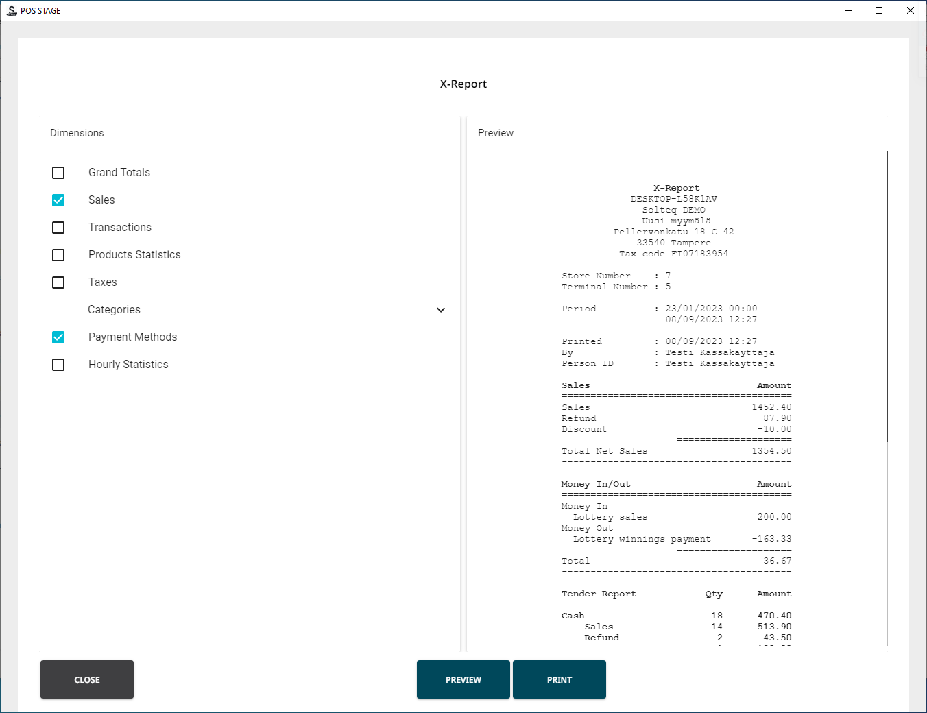 Select what content will be included in the report with the Dimensions checkboxes. Press Preview to update the view according to the chosen Dimensions.