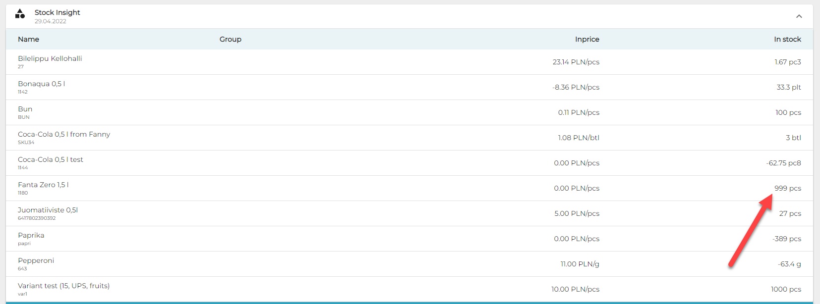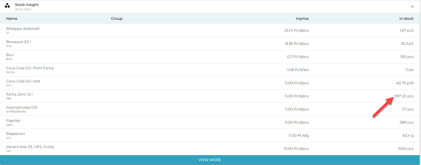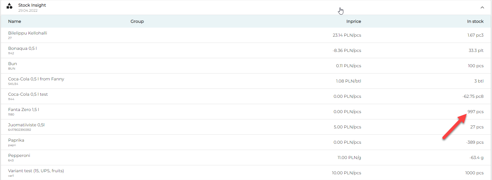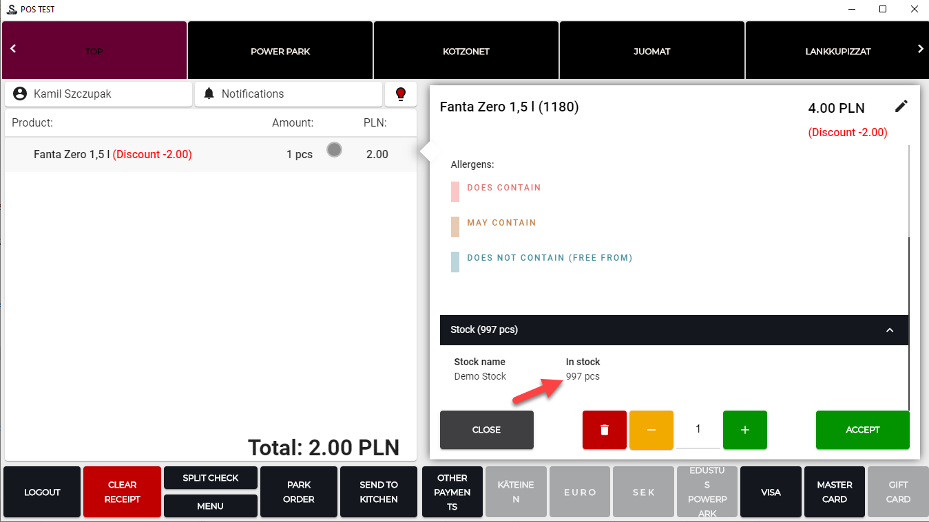 After an order with 2 pcs of Fanta is parked, the quantity is deducted accordingly. The deducted quantity is visible in both Back Office and POS; Back Office displays the quantity currently in the parked order.