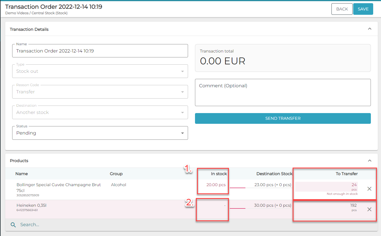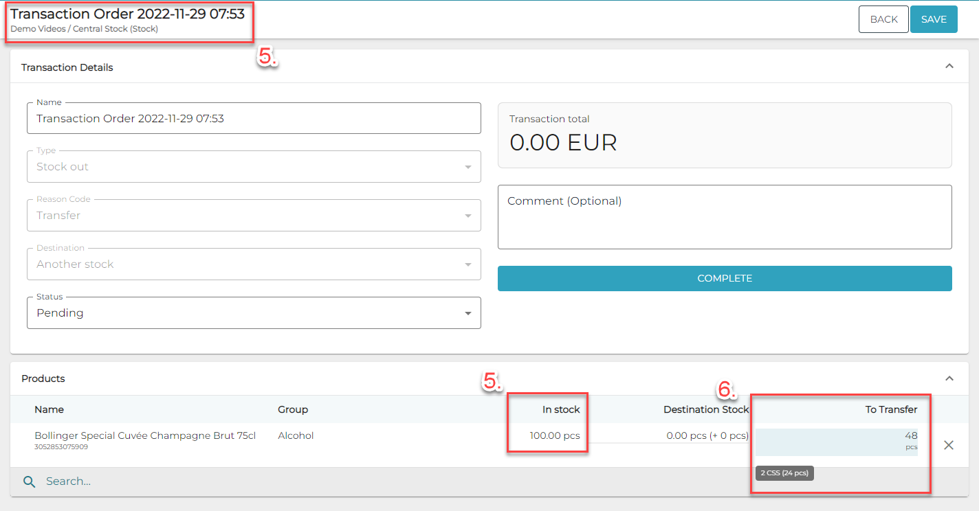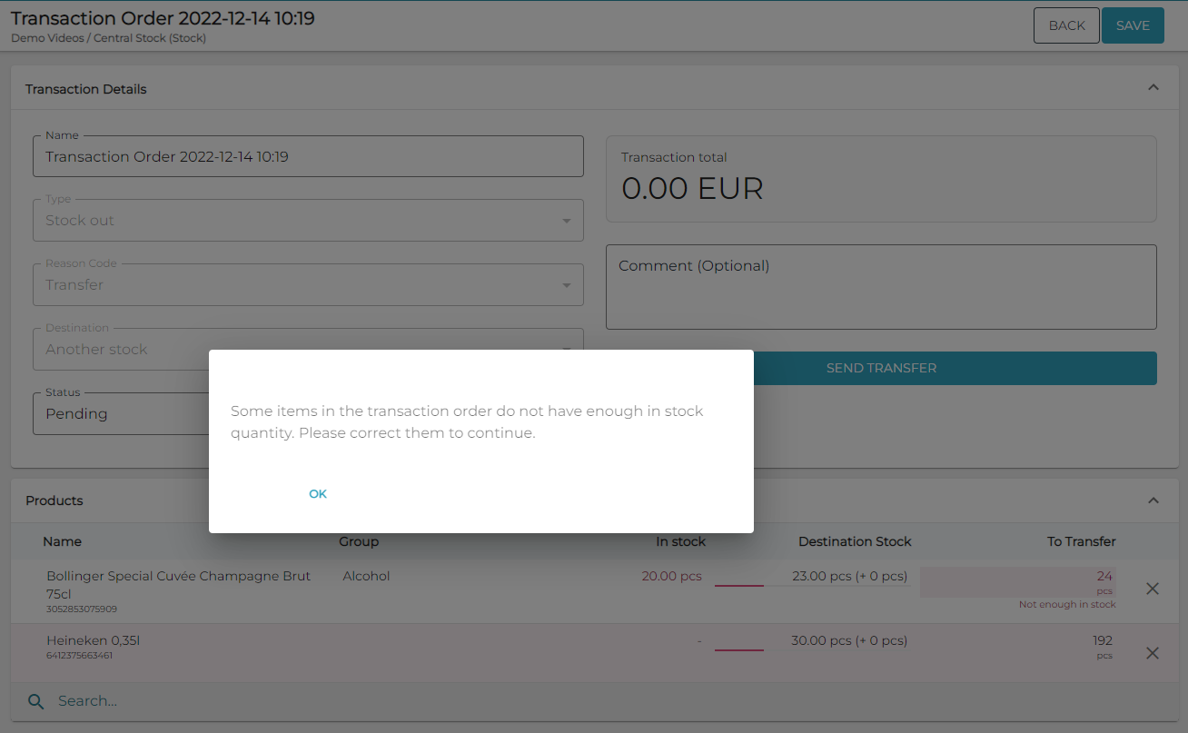 A new Stock Out transaction order with type Transfer is automatically created from the central stock, with the selected stock as the destination.