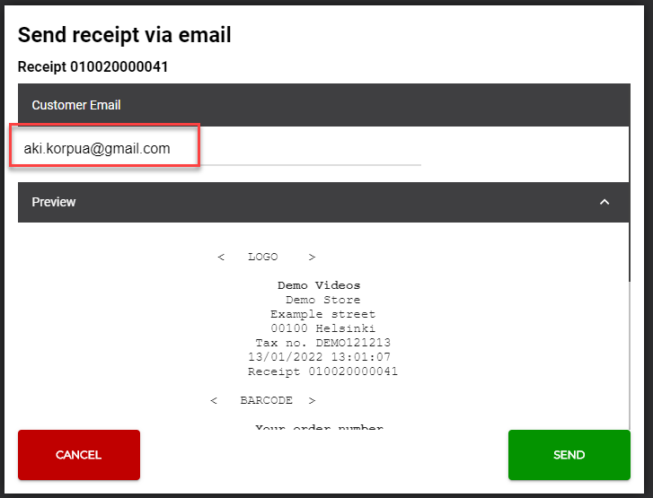 If the receipt contains customer data, the Customer Email field will be filled automatically; the contents of the field can also be modified, if needed. When you have checked that the address is correct, you can send the receipt via e-mail.