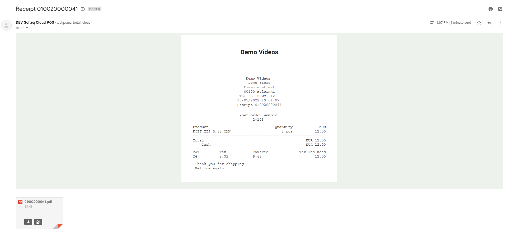 Below is an example of an e-mailed receipt.