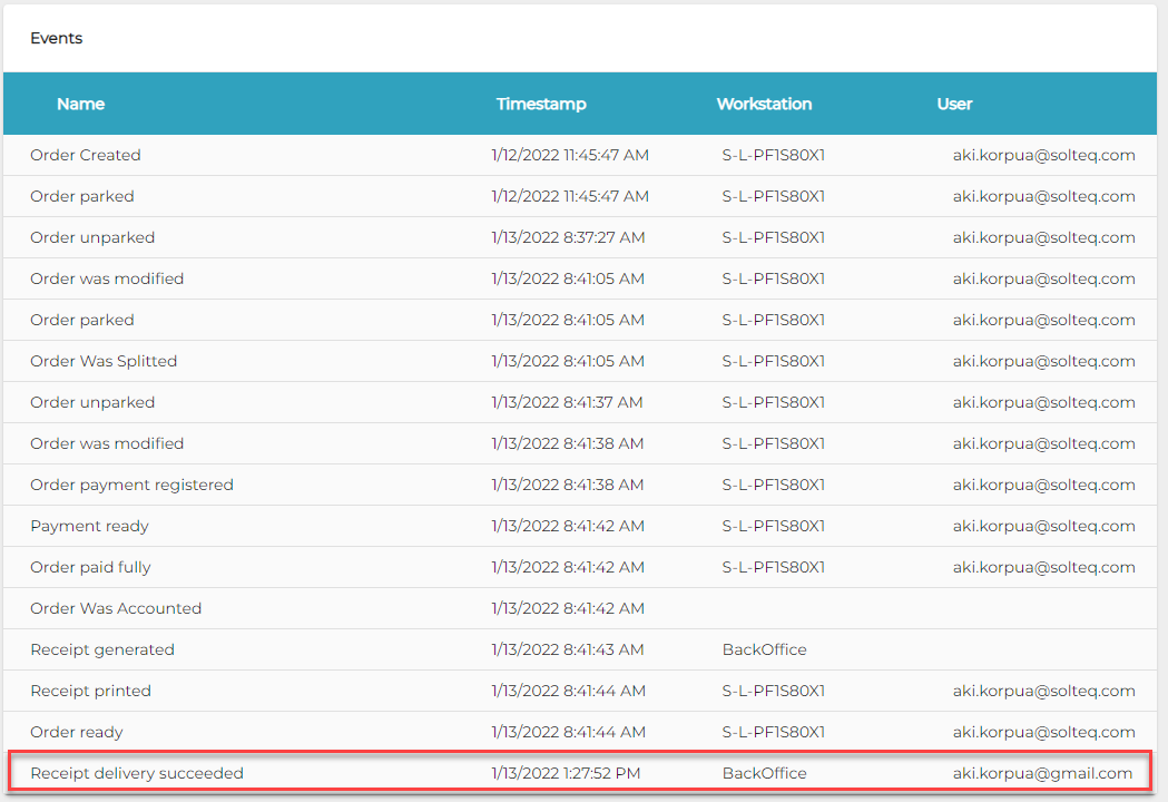 When the receipt has been sent, the Events information of the order will contain information about the sending: