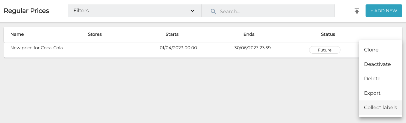 Select the list in the Regular Prices view and click the three dots on the row of the price list whose shelf labels you want to be collected.