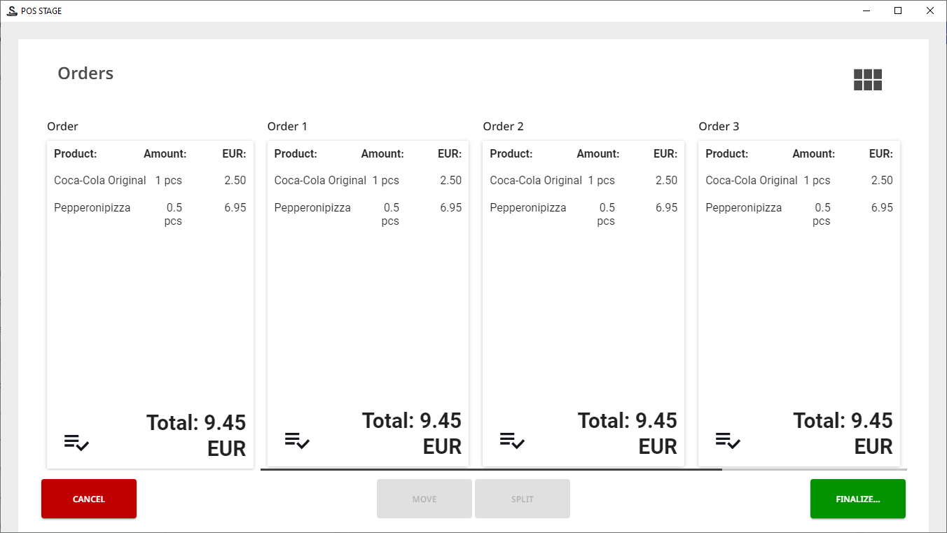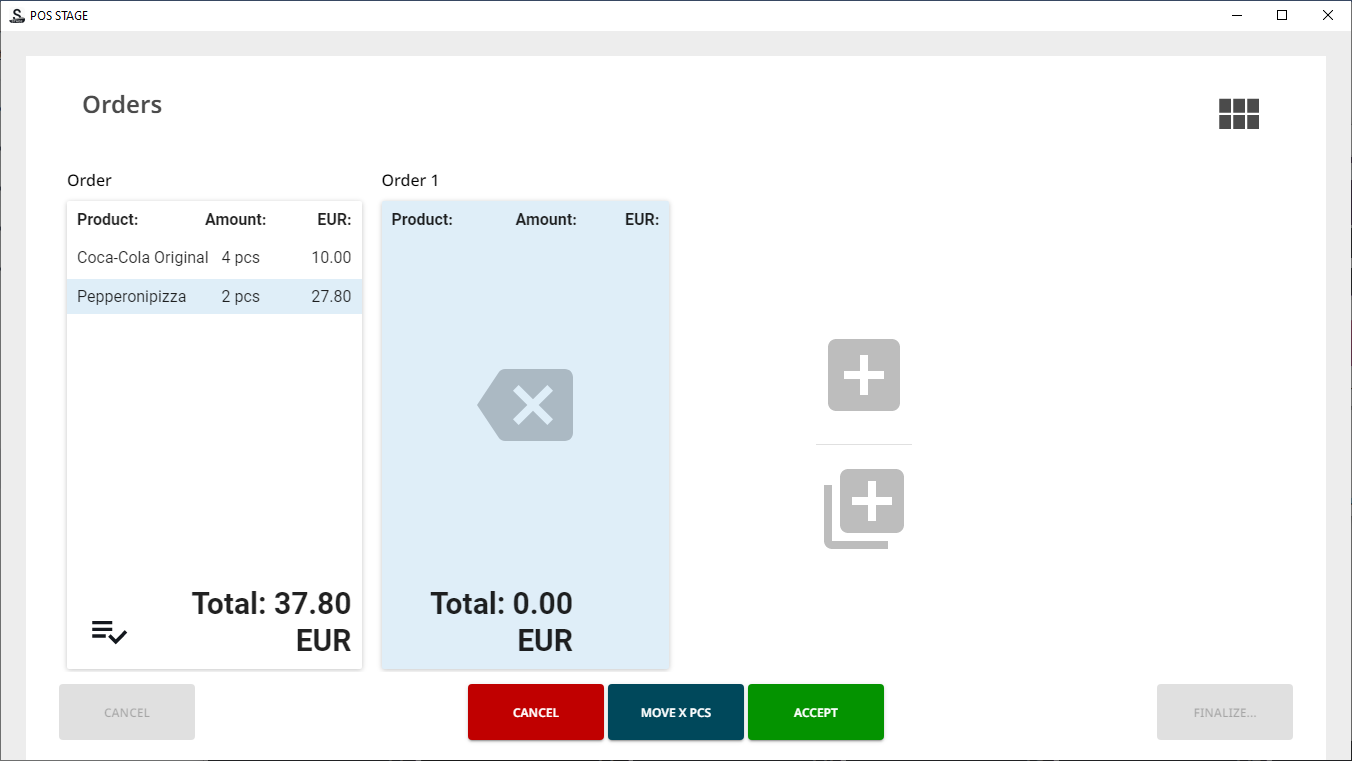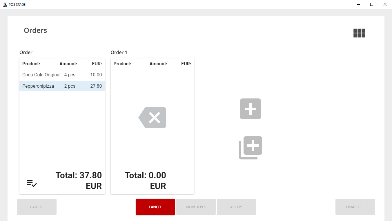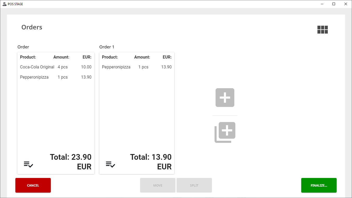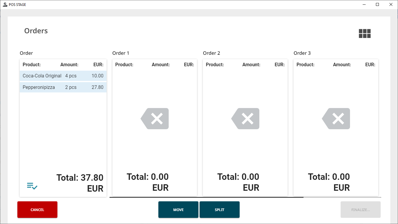 When there are products in the Basket, press Split Check in the POS. The Orders view containing the Basket contents is displayed.
