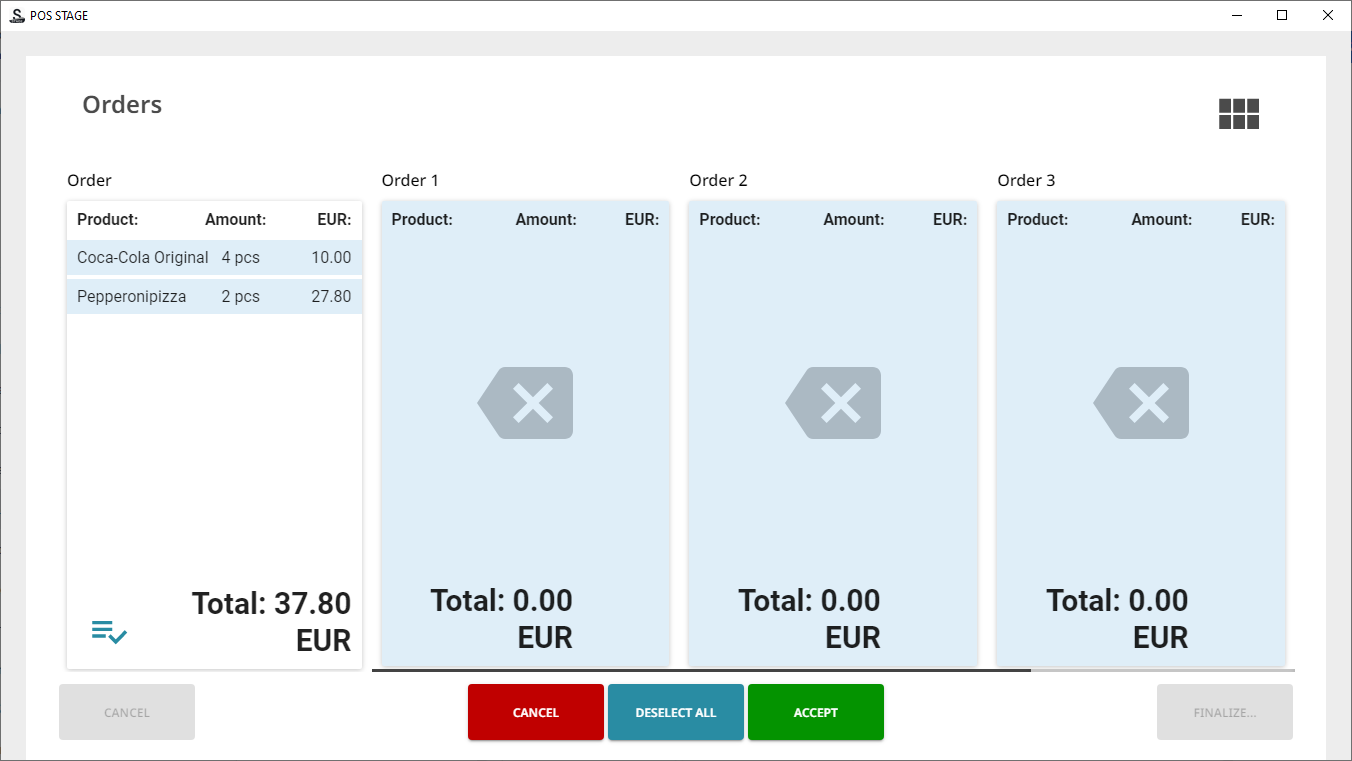 The order is split, and all the newly created orders are moved to Parked status. After two seconds of delay a Parked orders view containing these orders is displayed.