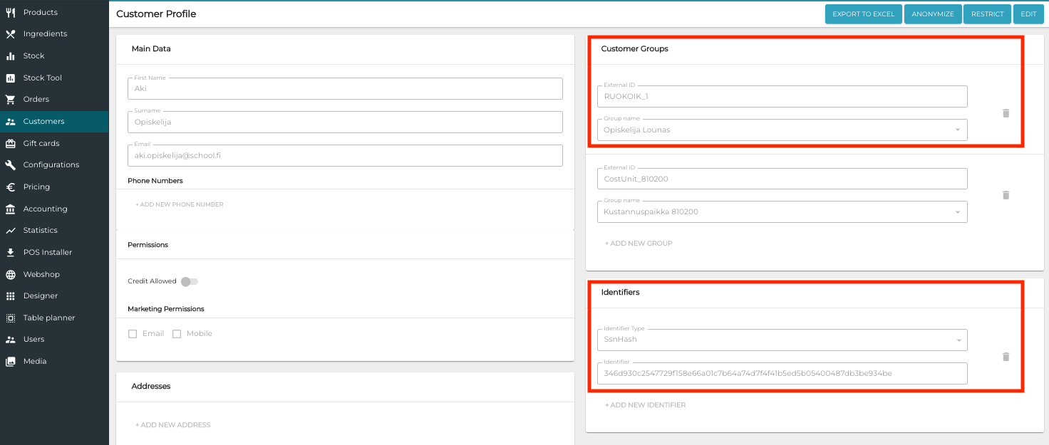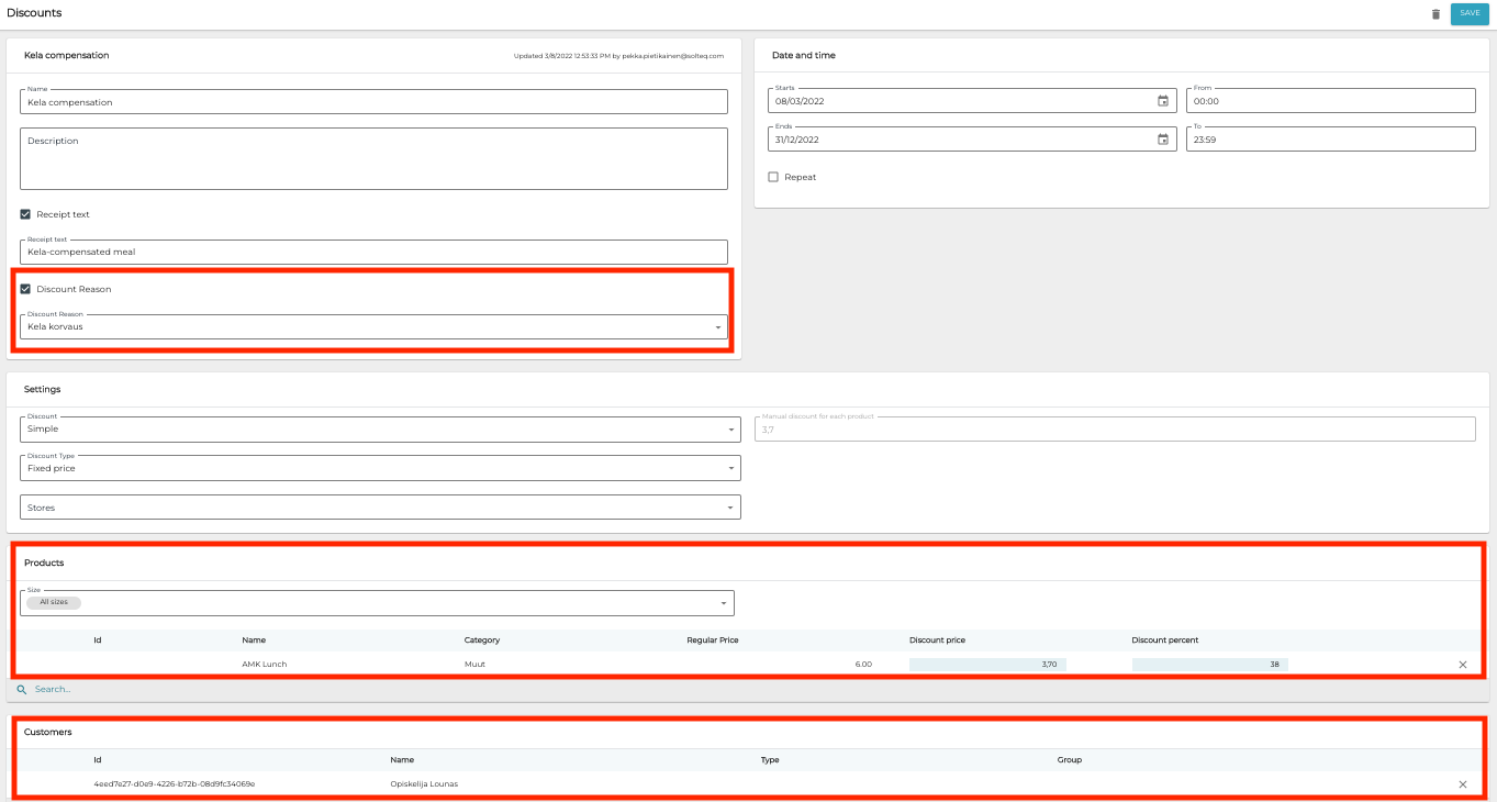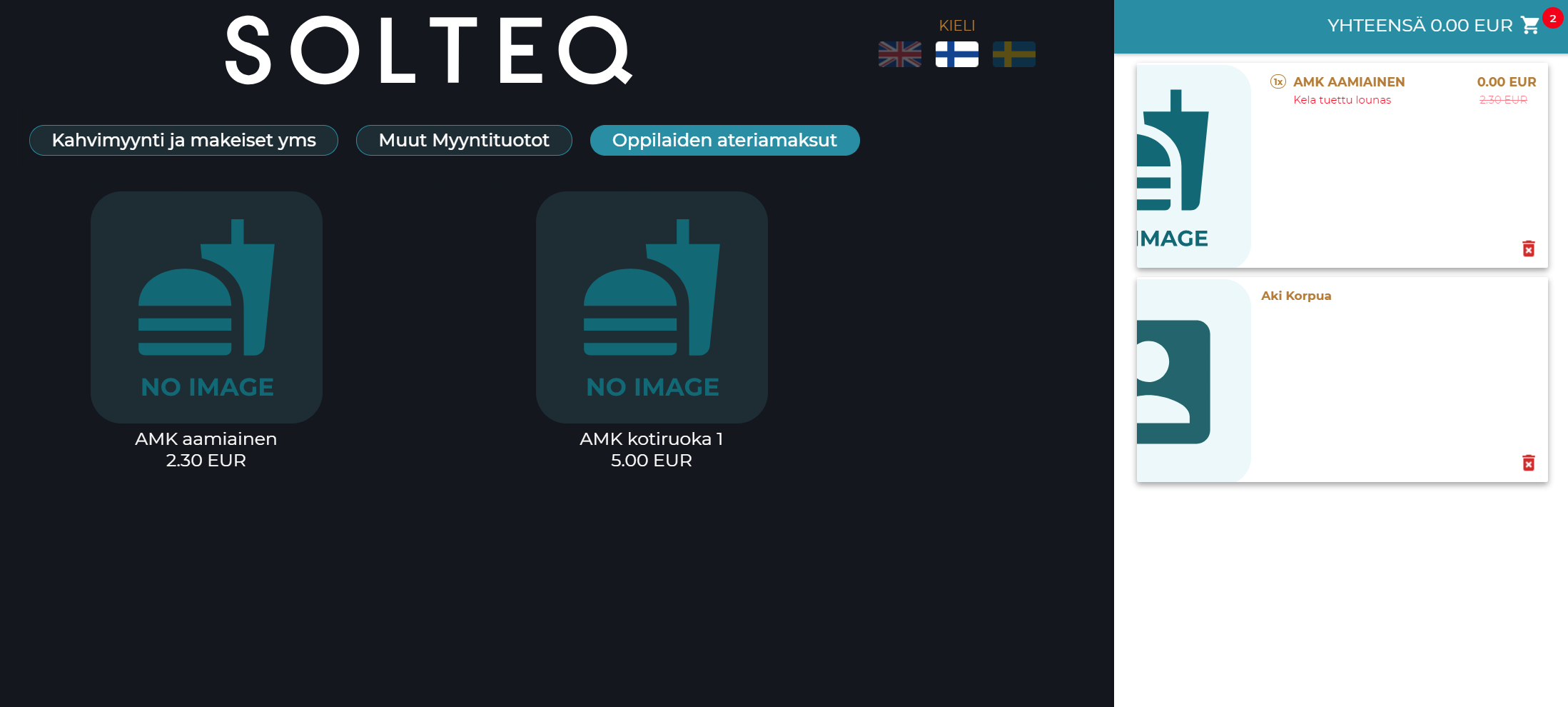 Solteq Commerce Cloud makes it possible to sell subsidized meals (for example, meals subsidized by Kela) for students in both POSs and Self-Service Kiosks. Using the functionality requires that you define the settings described on this page, as well as import the students' personal information to the system (where they will be added as customers).
