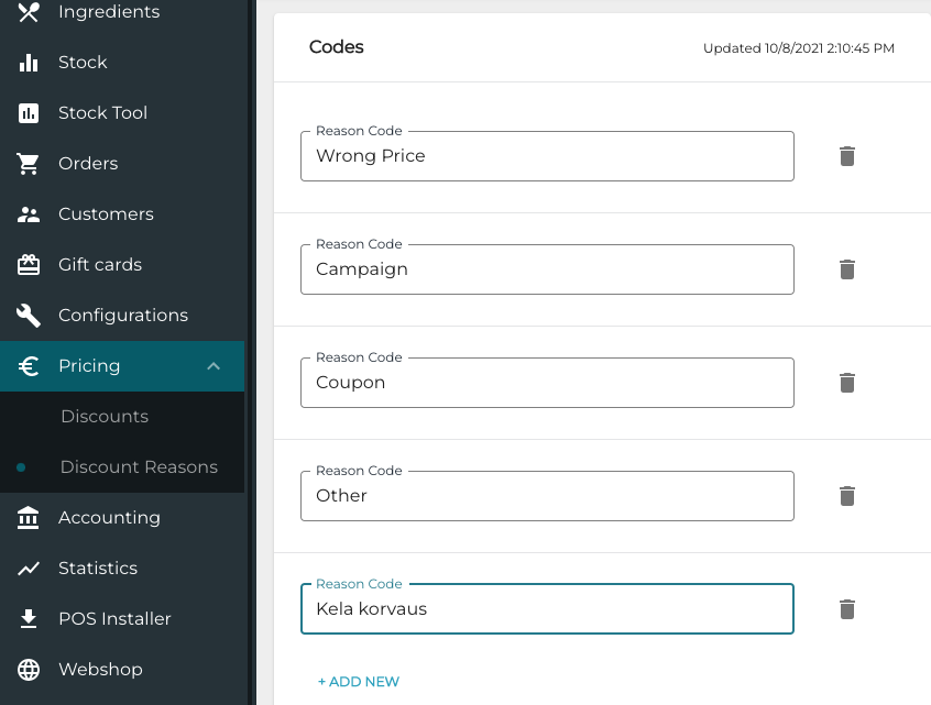 Create a new reason code for subsidized meals: (in this example: KELA korvaus)