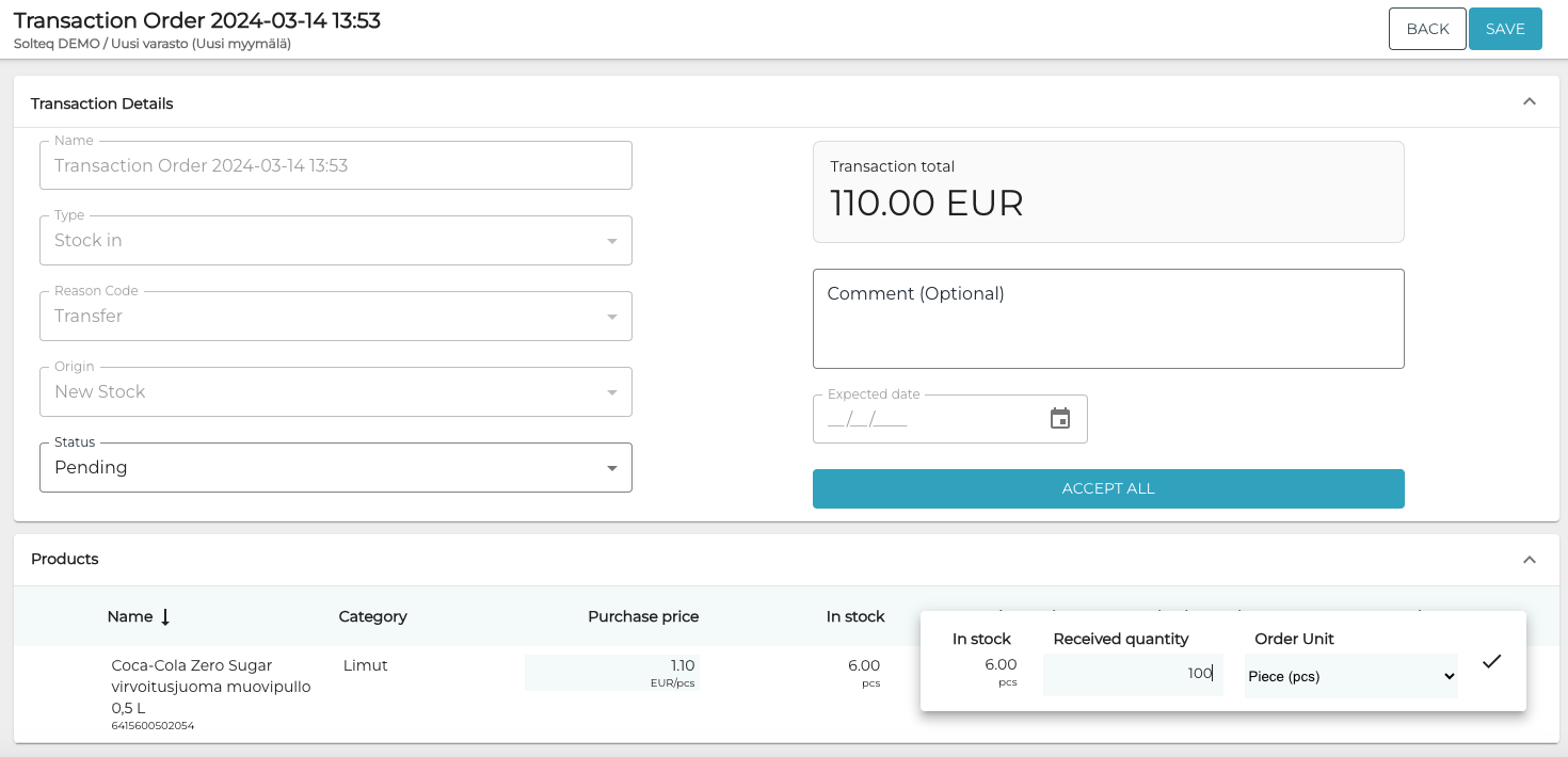 Click Accept All to finalize the Stock In transaction order (or Save to save it in Pending state without adjusting the Stock).