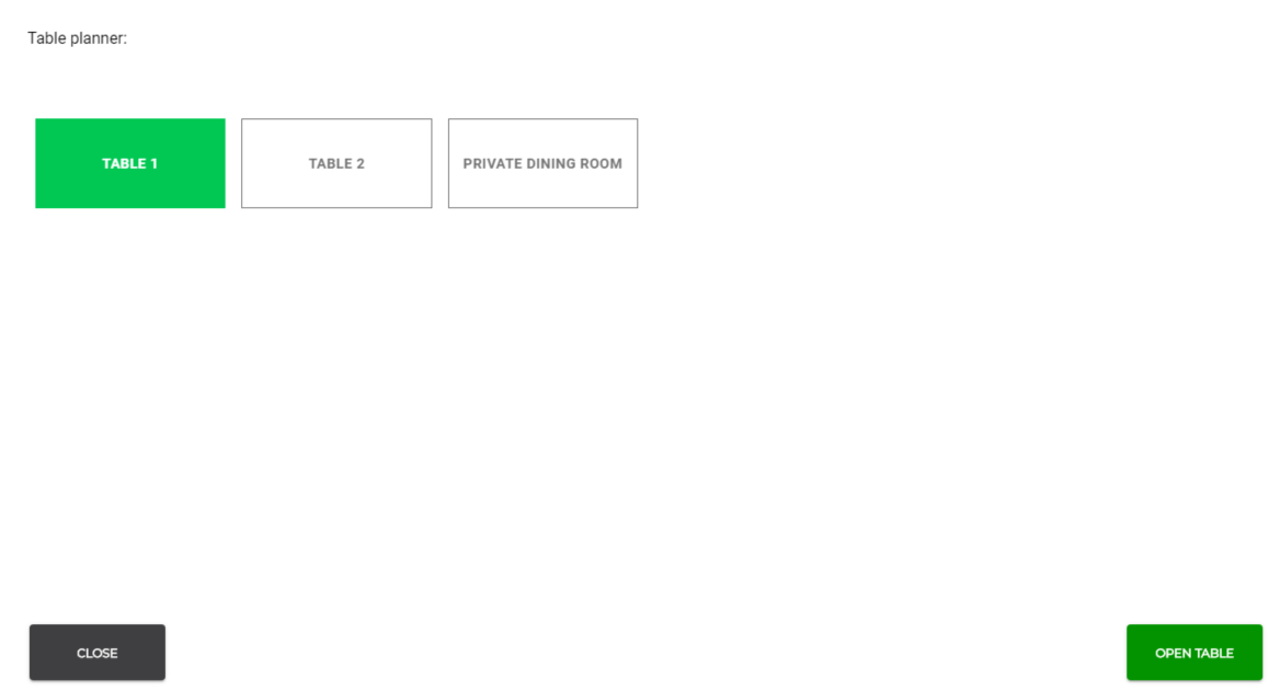 When table planner is enabled and table plan has been created in the Back Office, the POS menu will contain an Open Table tile (in addition, the POS layout may also contain an Open Table action tile, which can be used to open a table). Pressing the tile will open the Table planner view.