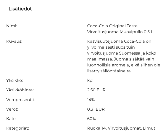 Tilauksesta näytetään seuraavanlaisia tietoja: