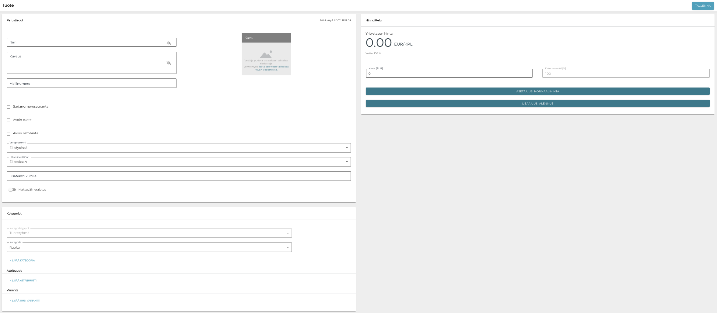 Varianttituotetta perustaessa sinun tulee syöttää tuotteelle vähintäänkin Nimi ja Veroprosentti sekä jokin kategoria, joka kuuluu oletusarvoiseen kategoriatyyppiin, jotta voit tallentaa tuotteen. Muut tiedot voidaan täyttää tuotteelle myös jälkikäteen. Tuotteen nimeäkin on mahdollista muokata jälkikäteen.