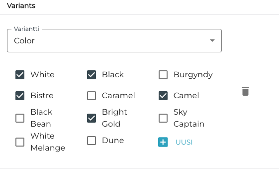 Variantteja käytetään tuotteen eri muunnelmien (kuten väri tai koko) luomiseksi. Varianttituotteelle voidaan luoda rajattomasti eri variantteja klikkaamalla +Lisää uusi variantti tuotteen Kategoriat-tiedoissa.