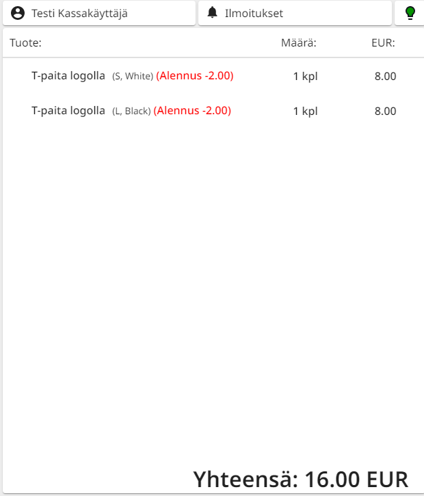 Jos varianttituotteelle on määritelty alennus, se vaikuttaa kaikkien tuotteen yksittäisten varianttien hintaan.