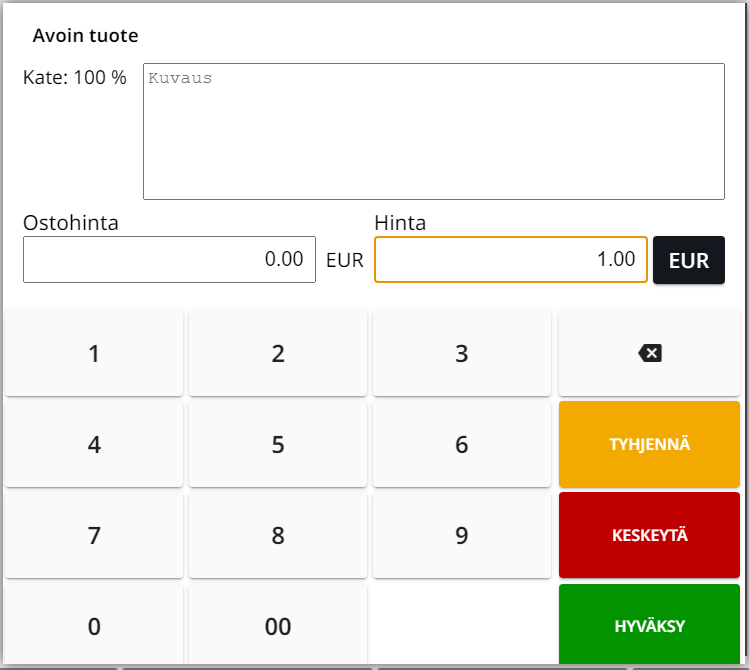 Jos tuotteelle on määritelty taustapalvelussa avoin ostohinta, ostohinta voidaan myös antaa kassalla kun tuote lisätään kassaan.