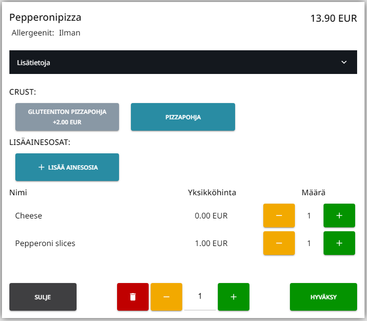 Kun vaihtoehdot on valittu, paina Hyväksy. Tällöin tuote siirtyy muiden tuotteiden tavoin ostoskoriin.