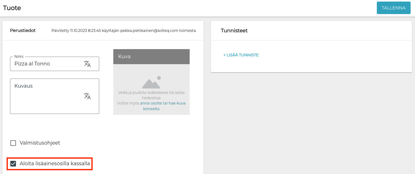 Jos haluat, että reseptituotteelle on valmiiksi annettu Lisäainesosia kun se lisätään kassalla ostoskoriin, klikkaa Aloita lisäainesosilla kassalla -valintaruutu aktiiviseksi reseptituotteen tiedoissa.