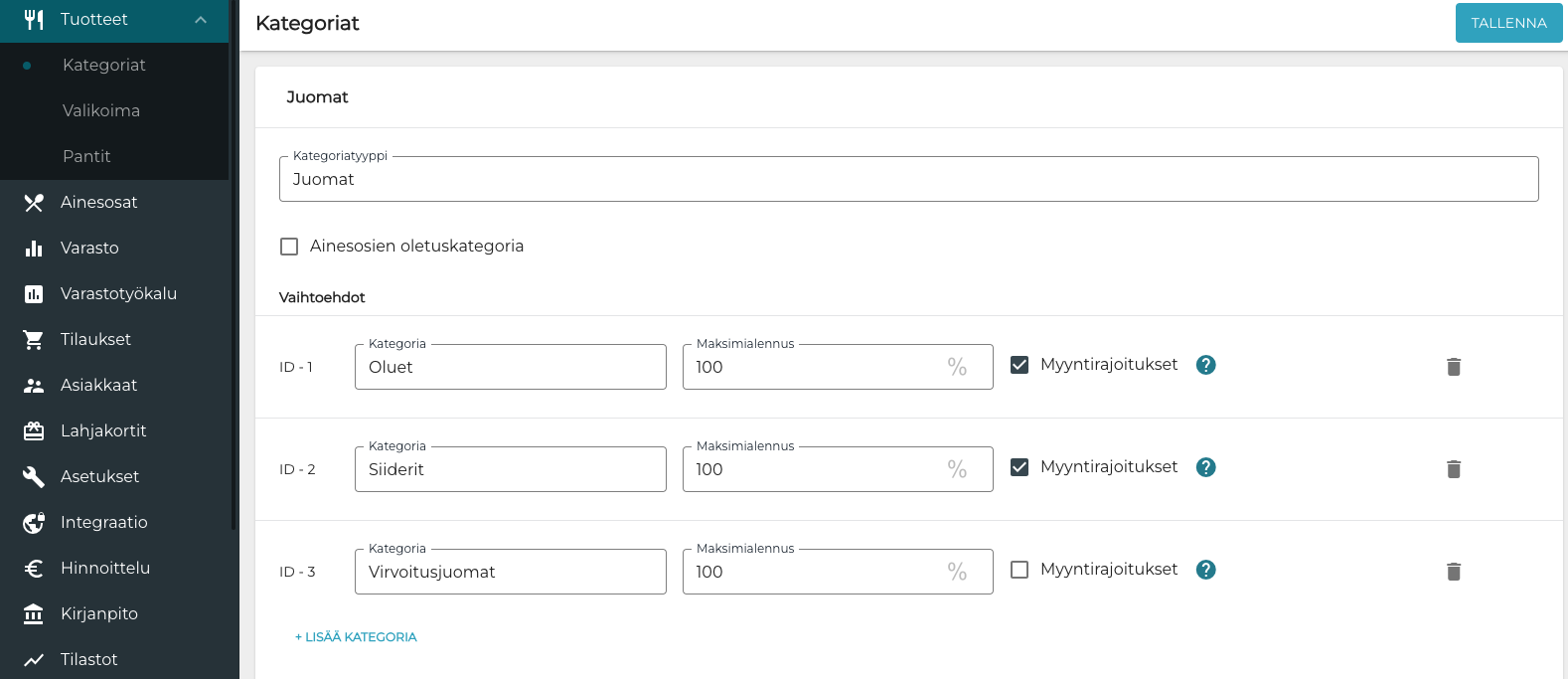 Älä poista Pantti-kategoriaa, vaikka yrityksessäsi eivät pantit olisikaan käytössä.
