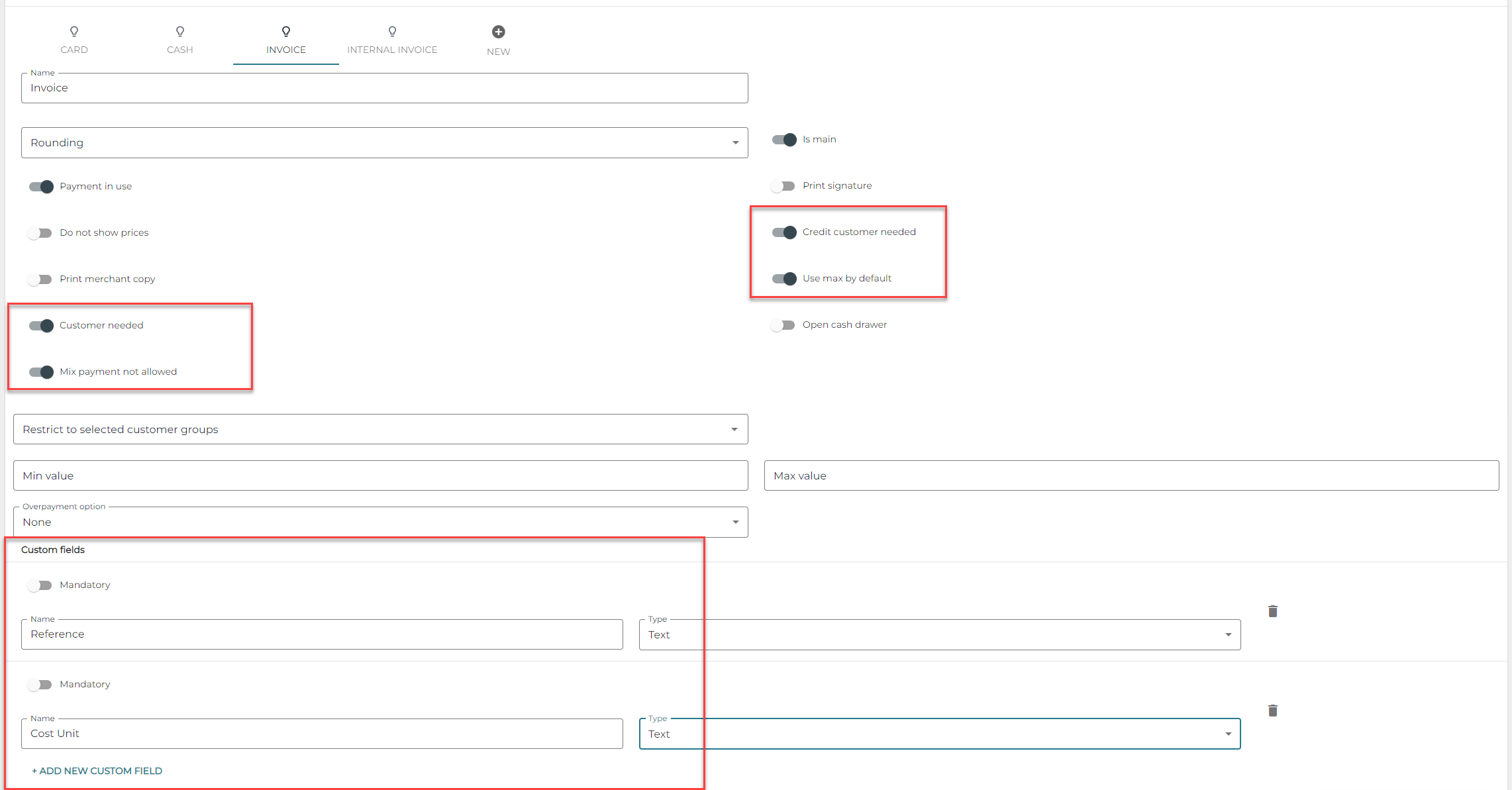 Varmista, että työaseman Payment Service-asetuksissa on määritelty Laskutus-maksutapa, jota siis käytetään laskulla maksettaviin ruokailuihin. Voit tarvittaessa määritellä useita eri nimisiä Laskutus-maksutapaa hyödyntäviä maksutapoja.