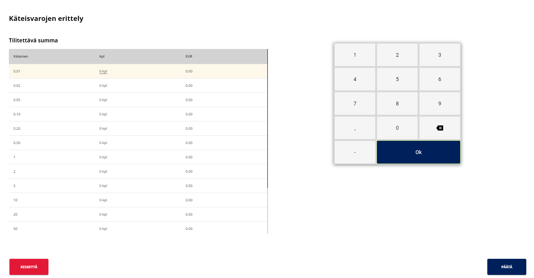 Voit tarvittaessa lisätä päävaluutalle ns. käteisvarojen erittelyn, jota käytetään kassalla tilityksien tekemisessä.