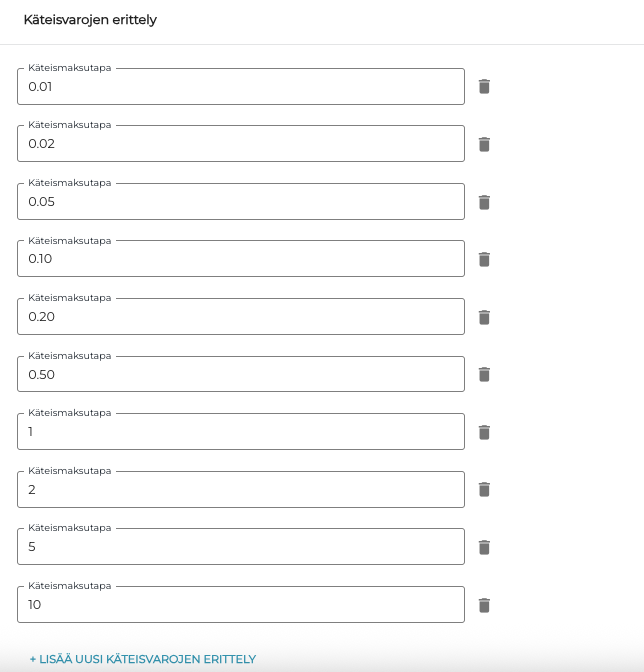 Syötä jokainen tarvittava Käteismaksutapa erikseen.