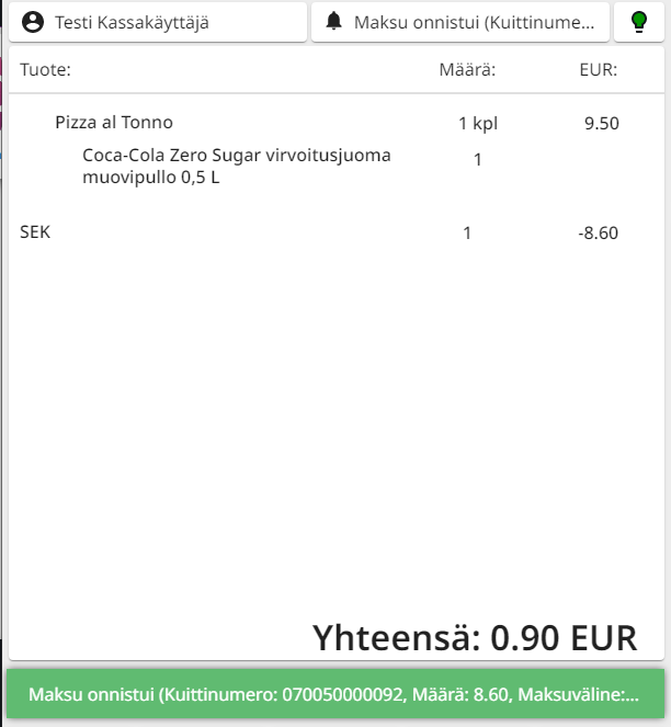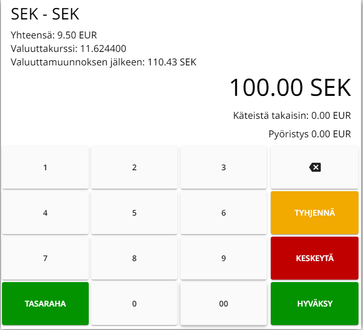 MIkäli asiakas maksaa arvoltaan suuremmalla rahasummalla kuin ostoskorin loppusumma, Käteistä takaisin -luku näytetään päävaluuttana.