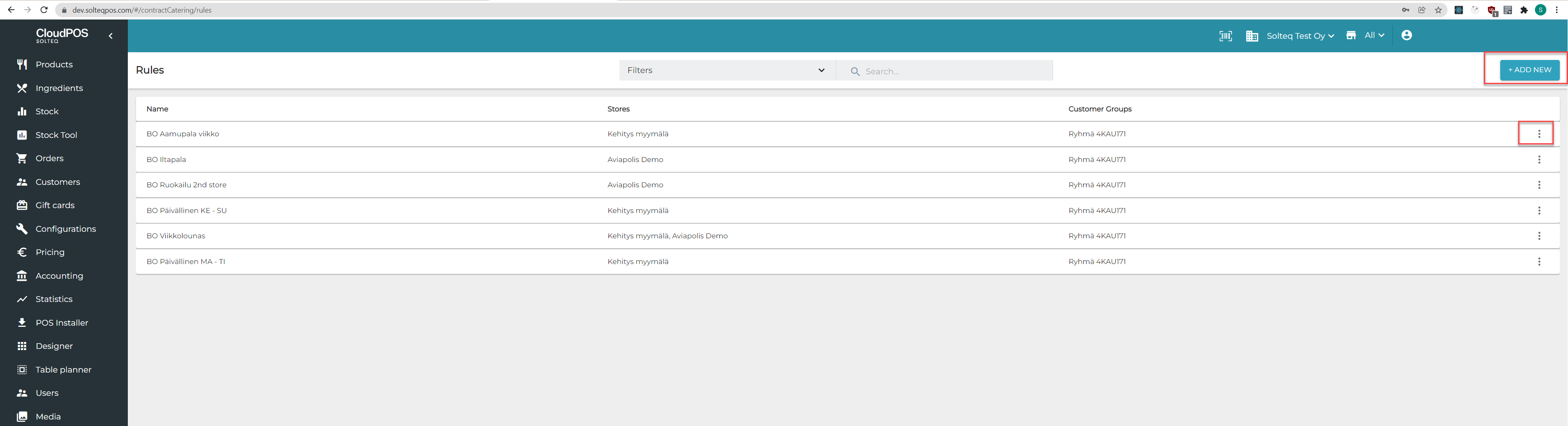 Lisää uusi sääntö klikkaamalla +Lisää uusi tai muokkaa olemassaolevaa sääntöä klikkaamalla Muokkaa-kuvaketta (kolme pistettä) sopimuksen rivillä.